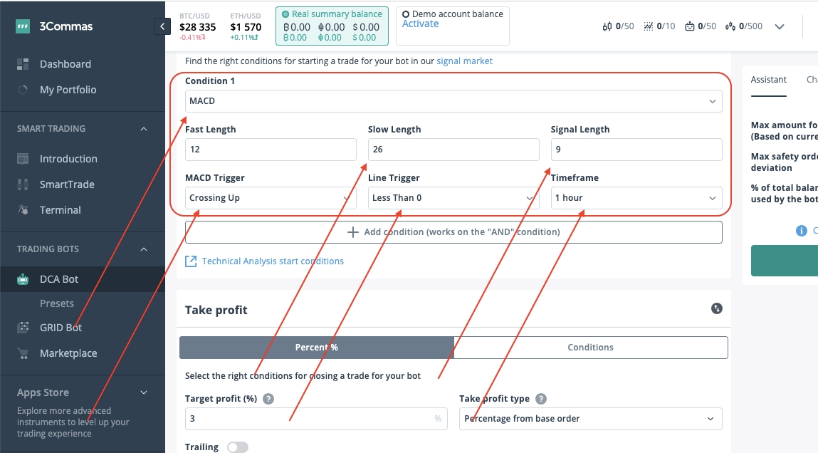How to set up a DCA bot in 3Commas using the MACD indicator.