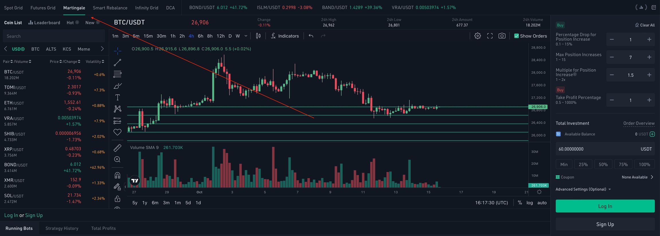 The Martingale strategy can only be executed using Spot type assets. Here you will find a complete list of all cryptocurrencies listed in the spot section of KuCoin: https://www.kucoin.com/markets/spot/USDS